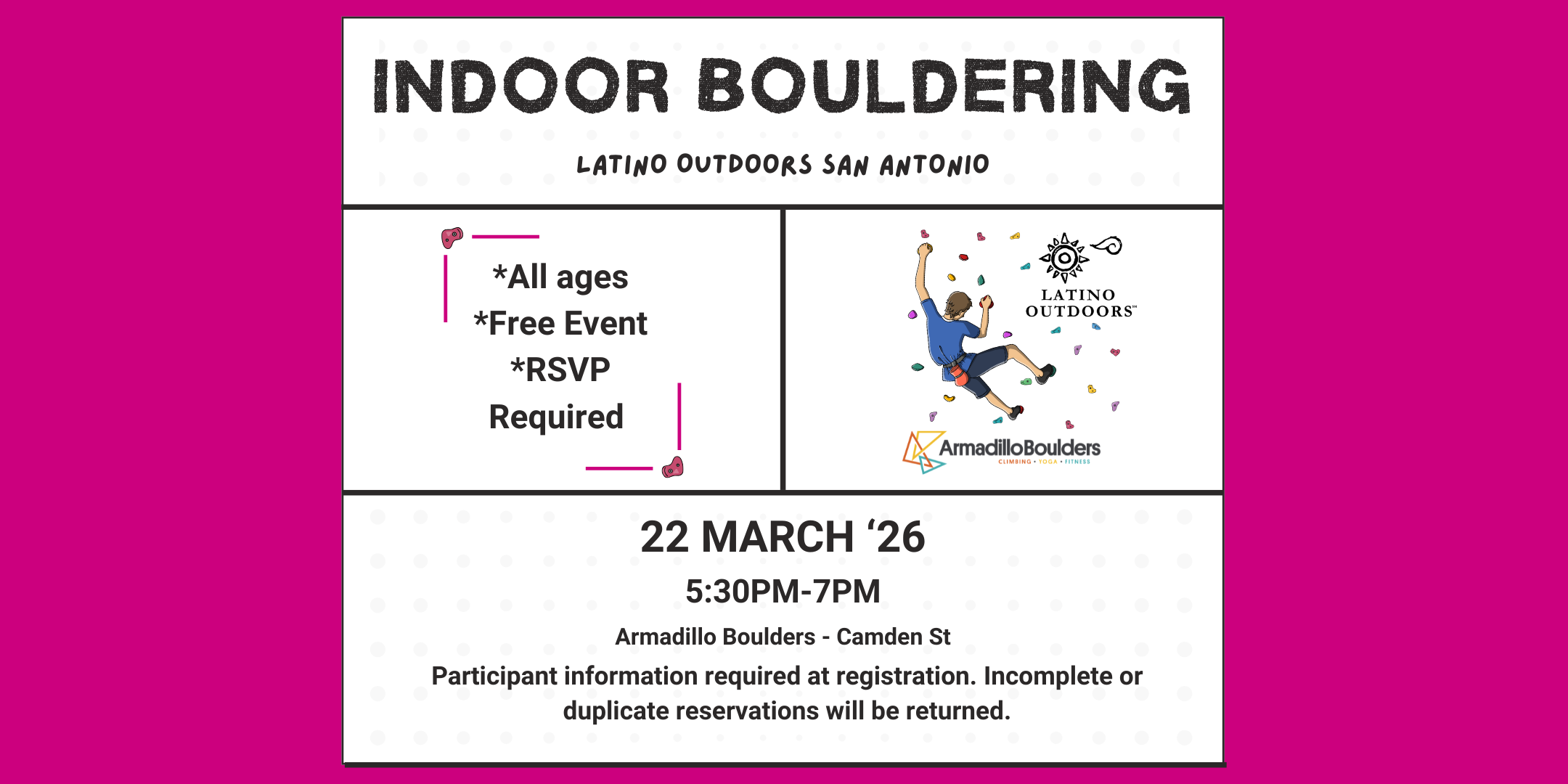 - You must sign the gym waiver if it is your first time. The Latino Outdoors waiver will be emailed to you before the event.